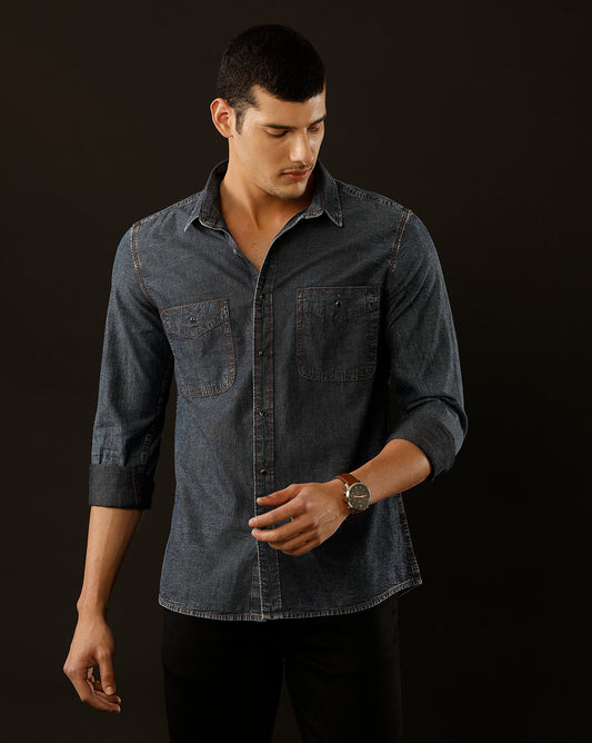 Men's Slim Fit Solid Denim Casual Shirt (POKER)